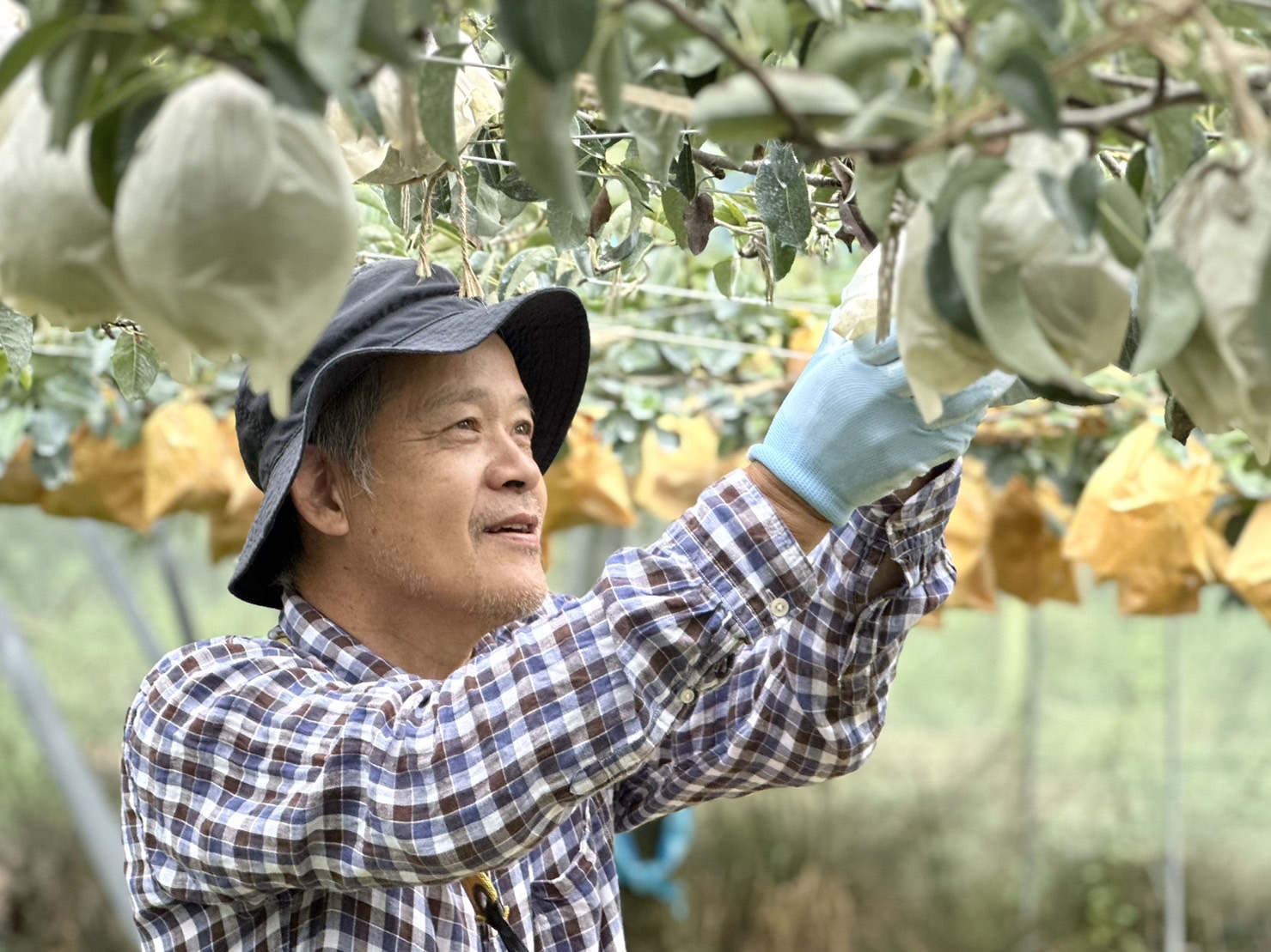 山梨県北杜市にある岩原果樹園にて、一つ一つ丁寧に袋掛けを行う園主の岩原さん。